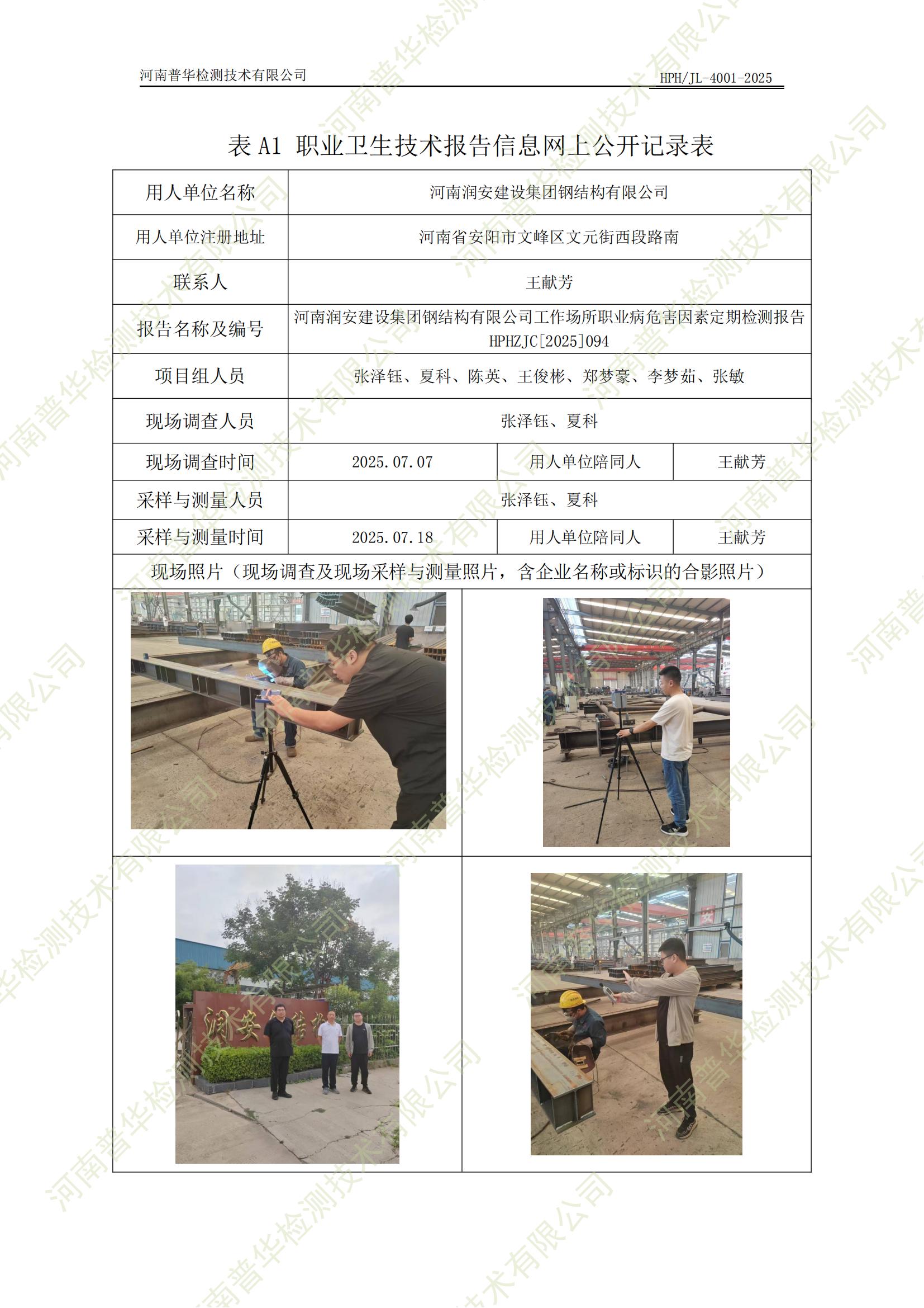 河南润安建设集团钢结构有限公司工作场所职业病危害因素定期检测 点击次数:199 次