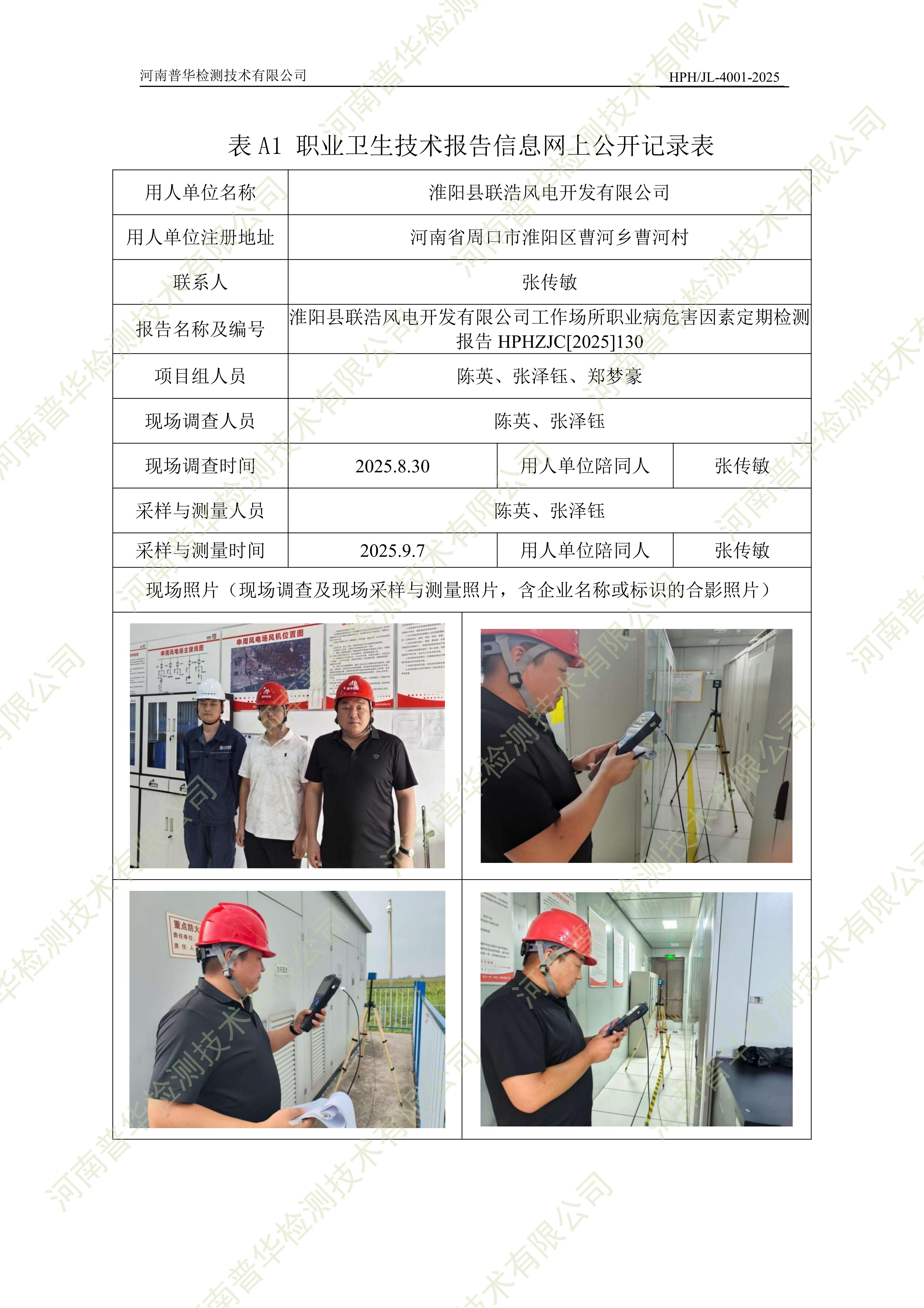 淮阳县联浩风电开发有限公司工作场所职业病危害因素定期检测 点击次数:70 次