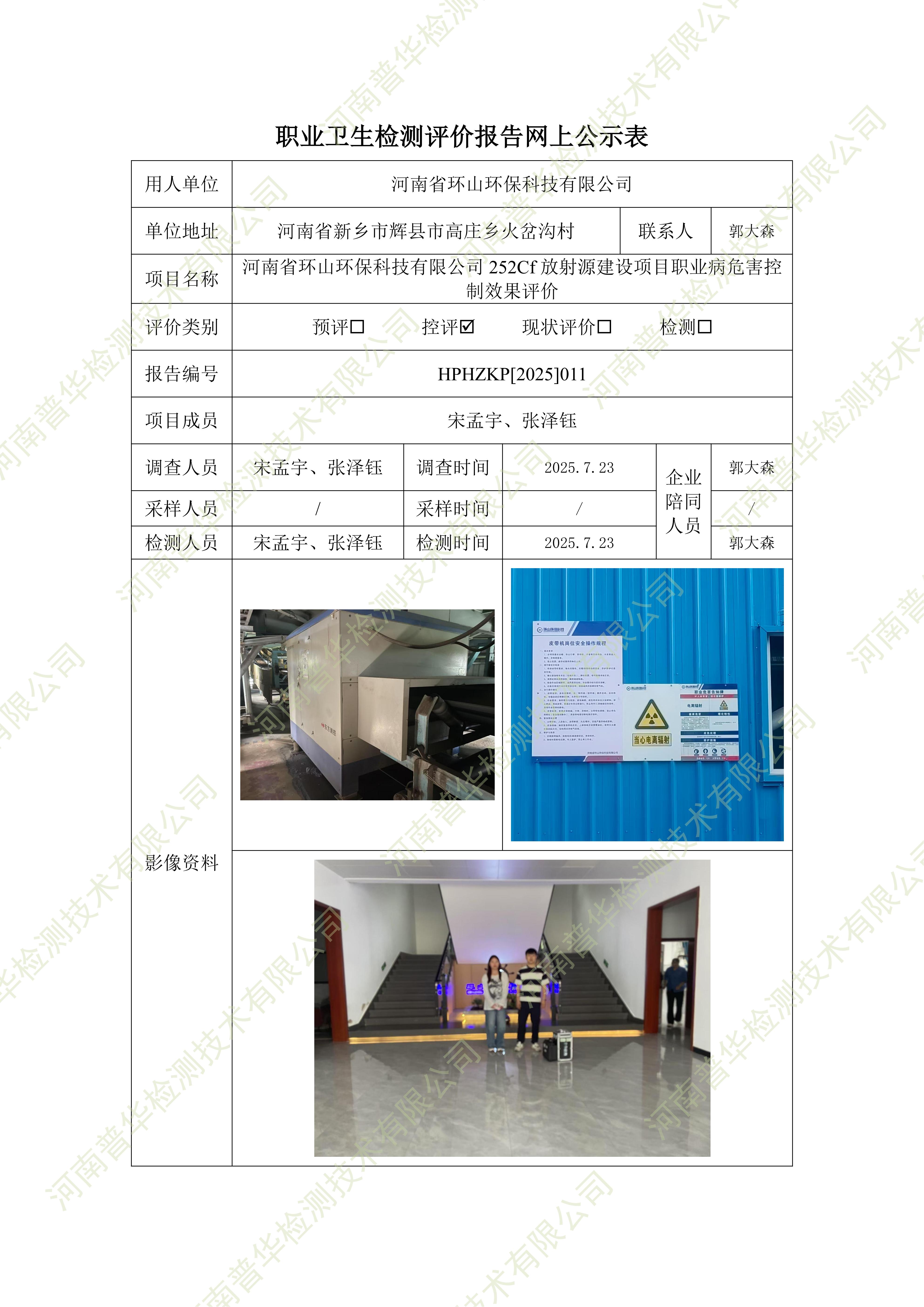 河南省环山环保科技有限公司252Cf放射源建设项目职业病危害控制效果评价 点击次数:59 次