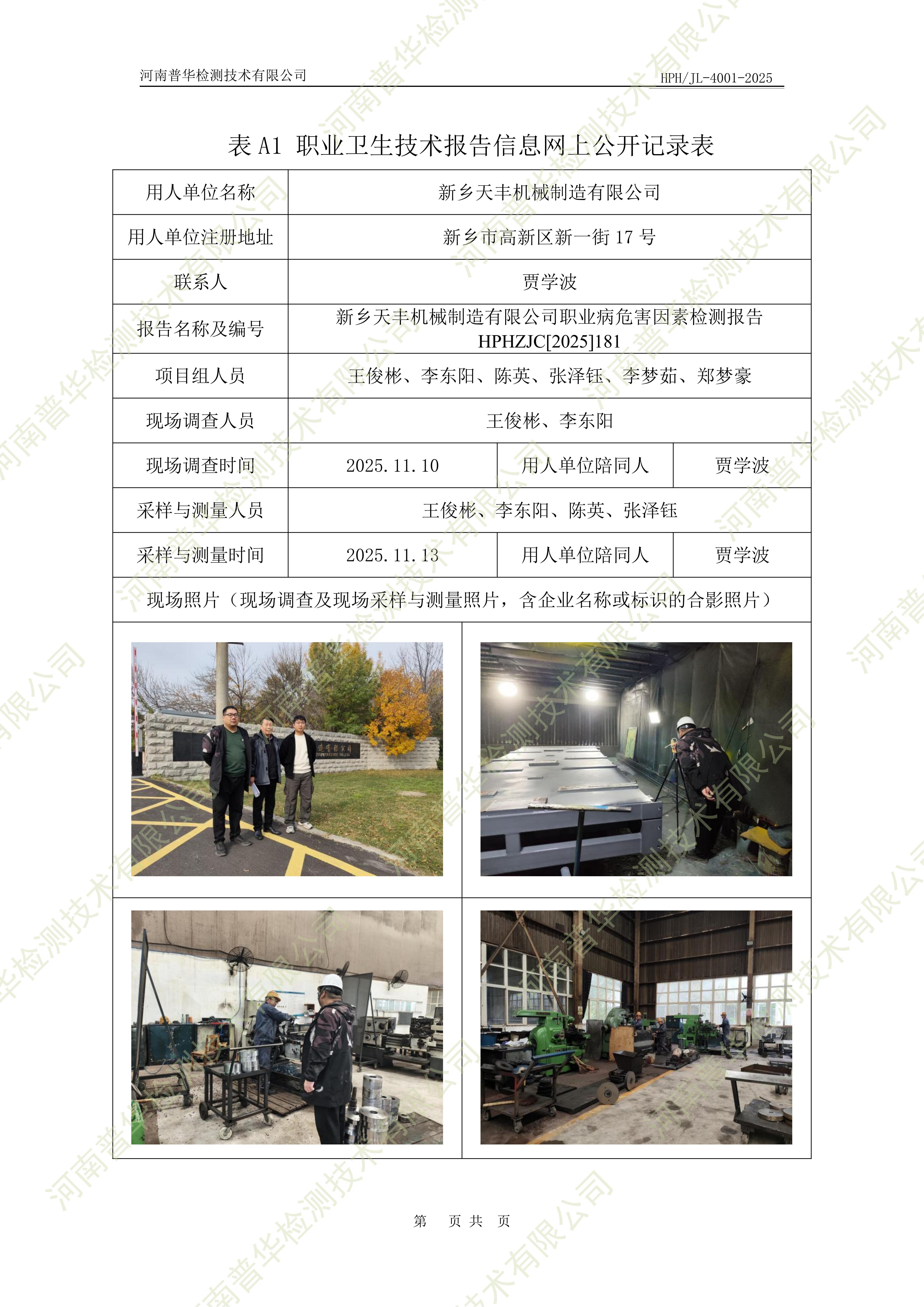 新乡天丰机械制造有限公司职业病危害因素检测 点击次数:35 次