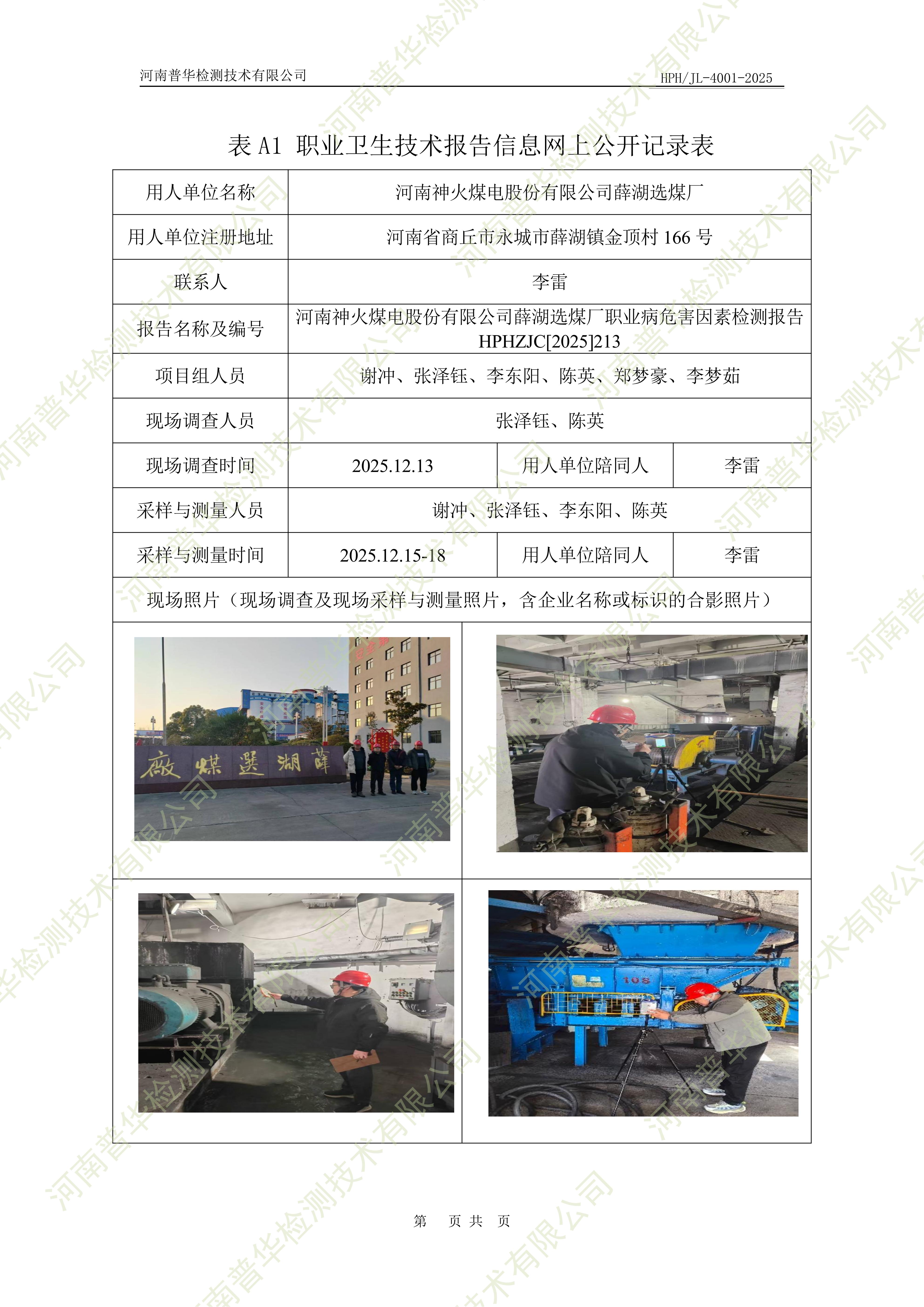 河南神火煤电股份有限公司薛湖选煤厂职业病危害因素检测 点击次数:139 次