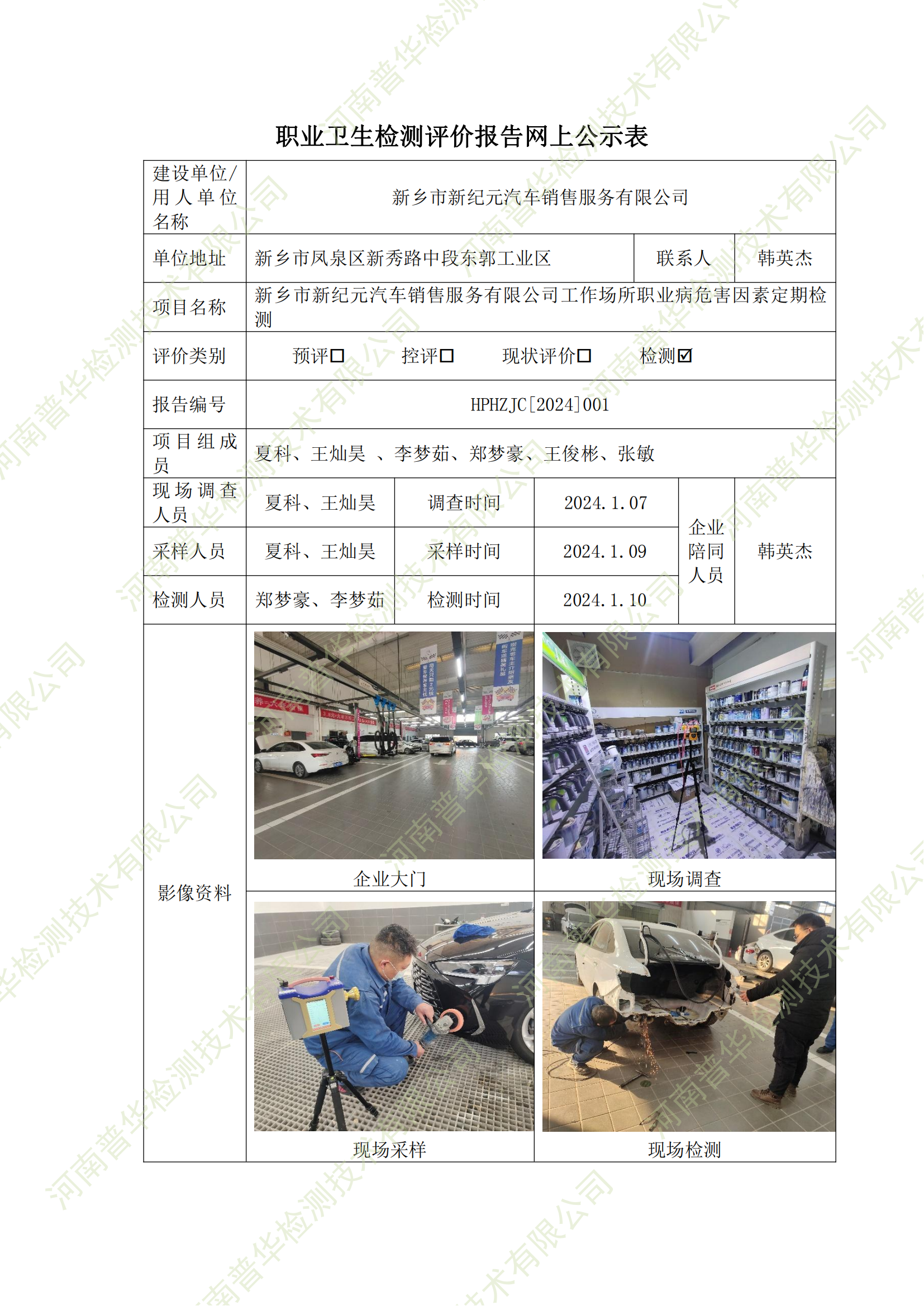 新乡市新纪元汽车销售服务有限公司工作场所职业病危害因素定期检测 点击次数:955 次