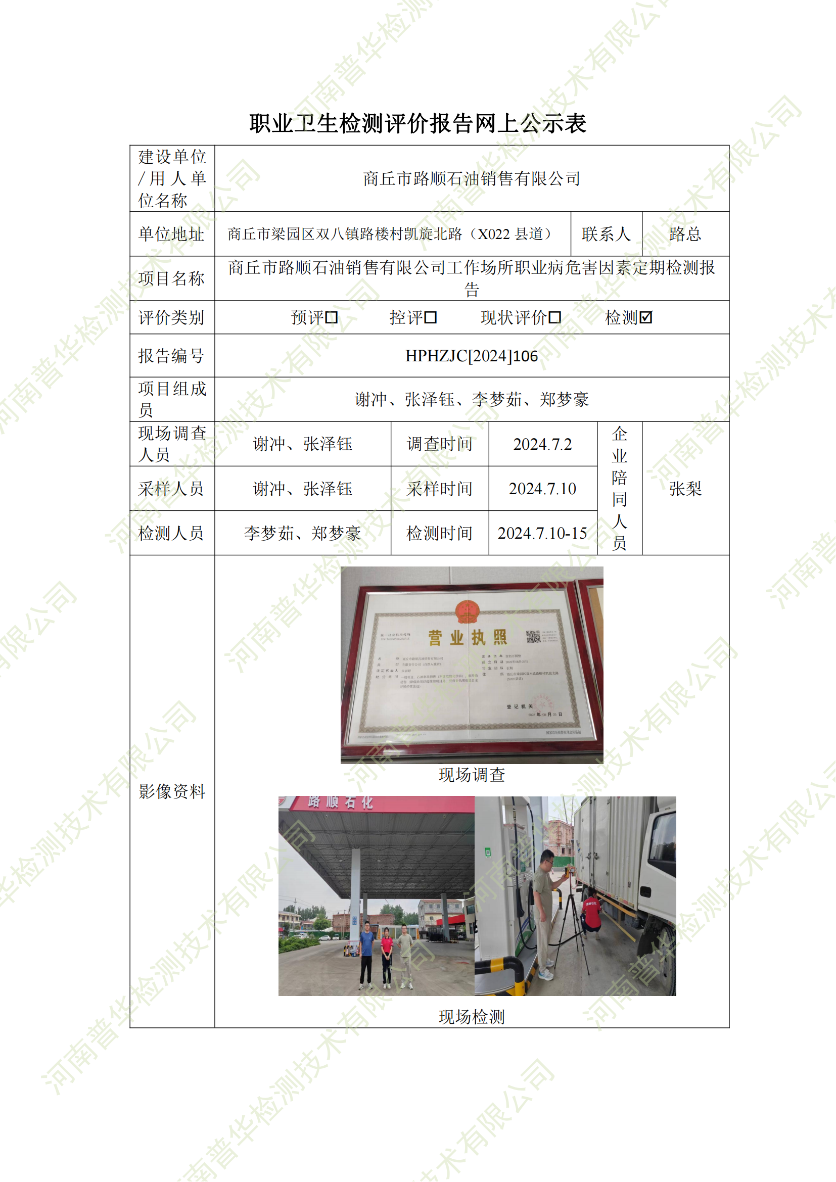 商丘市路顺石油销售有限公司工作场所职业病危害因素定期检测 点击次数:1067 次