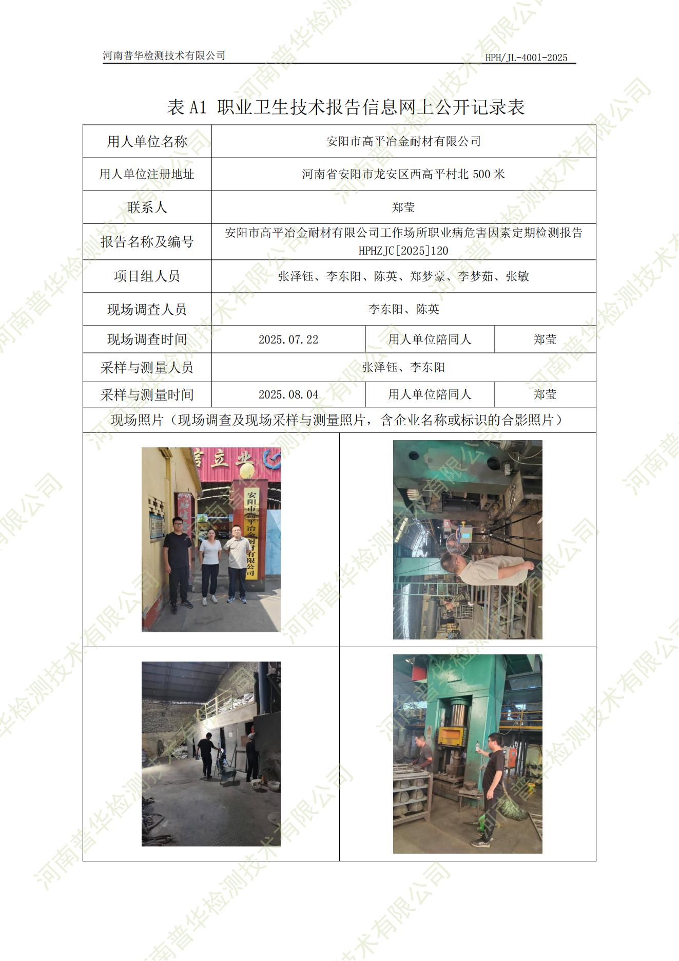 安阳市高平冶金耐材有限公司工作场所职业病危害因素定期检测 点击次数:68 次