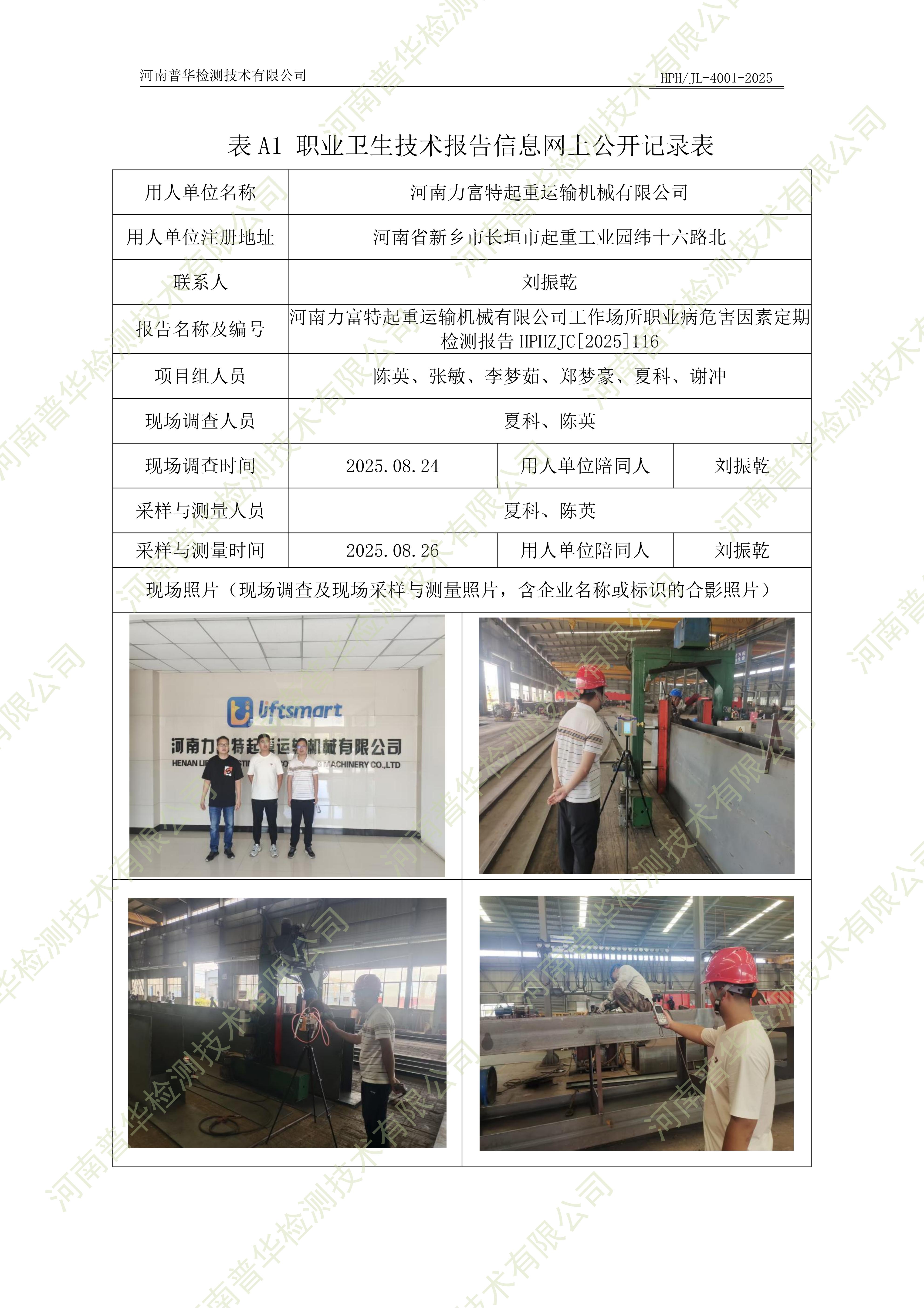 河南力富特起重运输机械有限公司工作场所职业病危害因素定期检测 点击次数:81 次