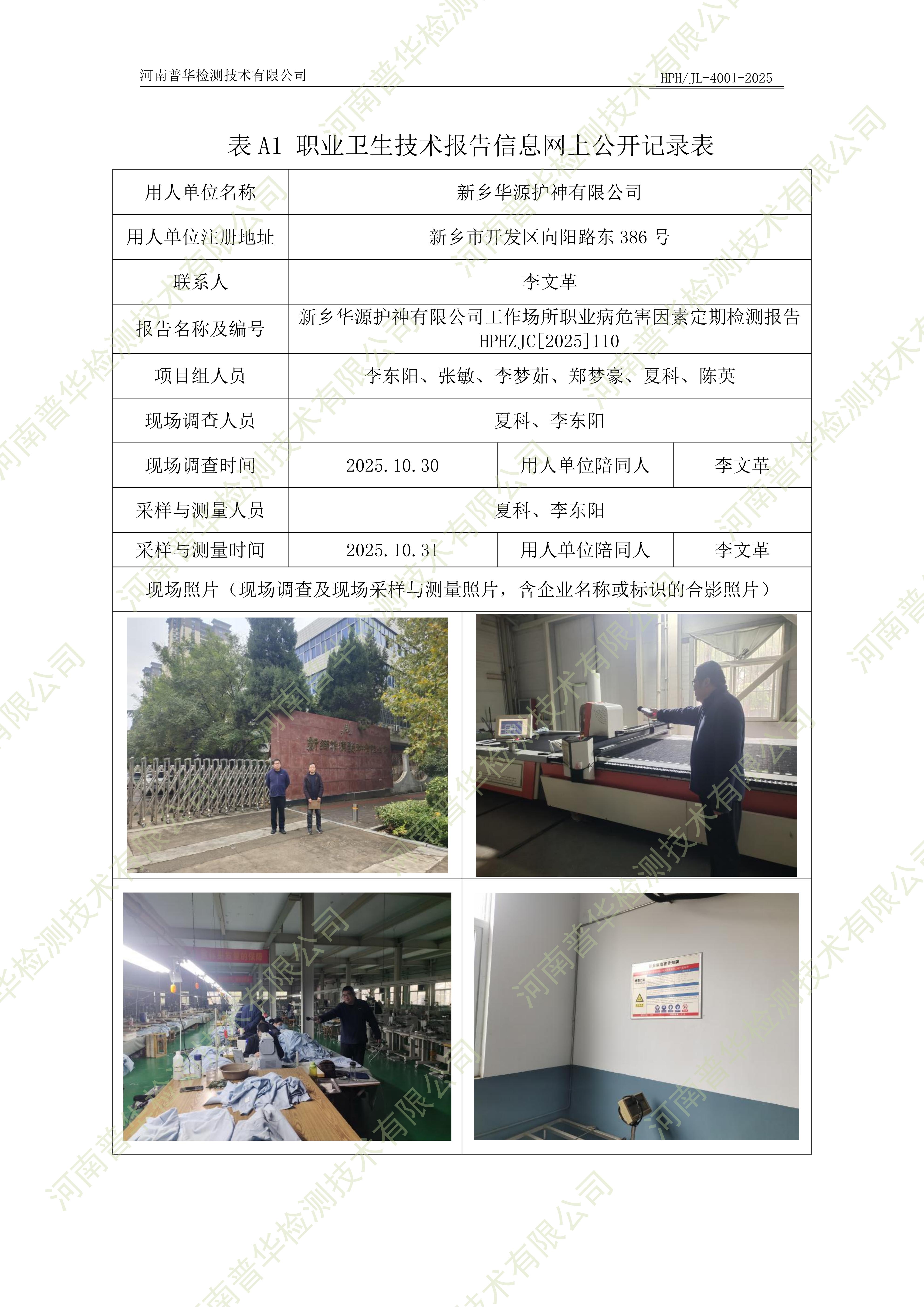 新乡华源护神有限公司工作场所职业病危害因素定期检测 点击次数:60 次