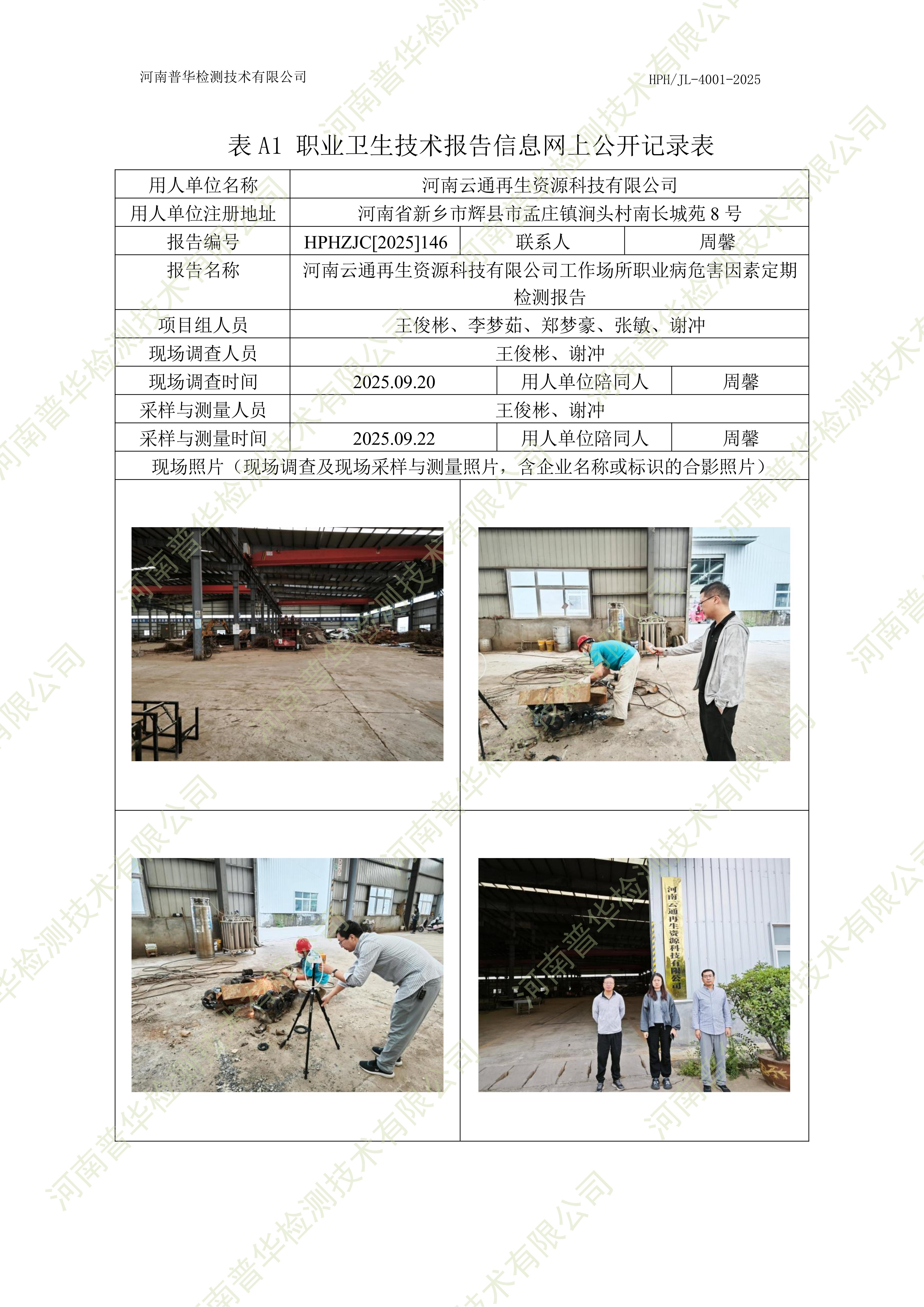河南云通再生资源科技有限公司工作场所职业病危害因素定期检测 点击次数:30 次