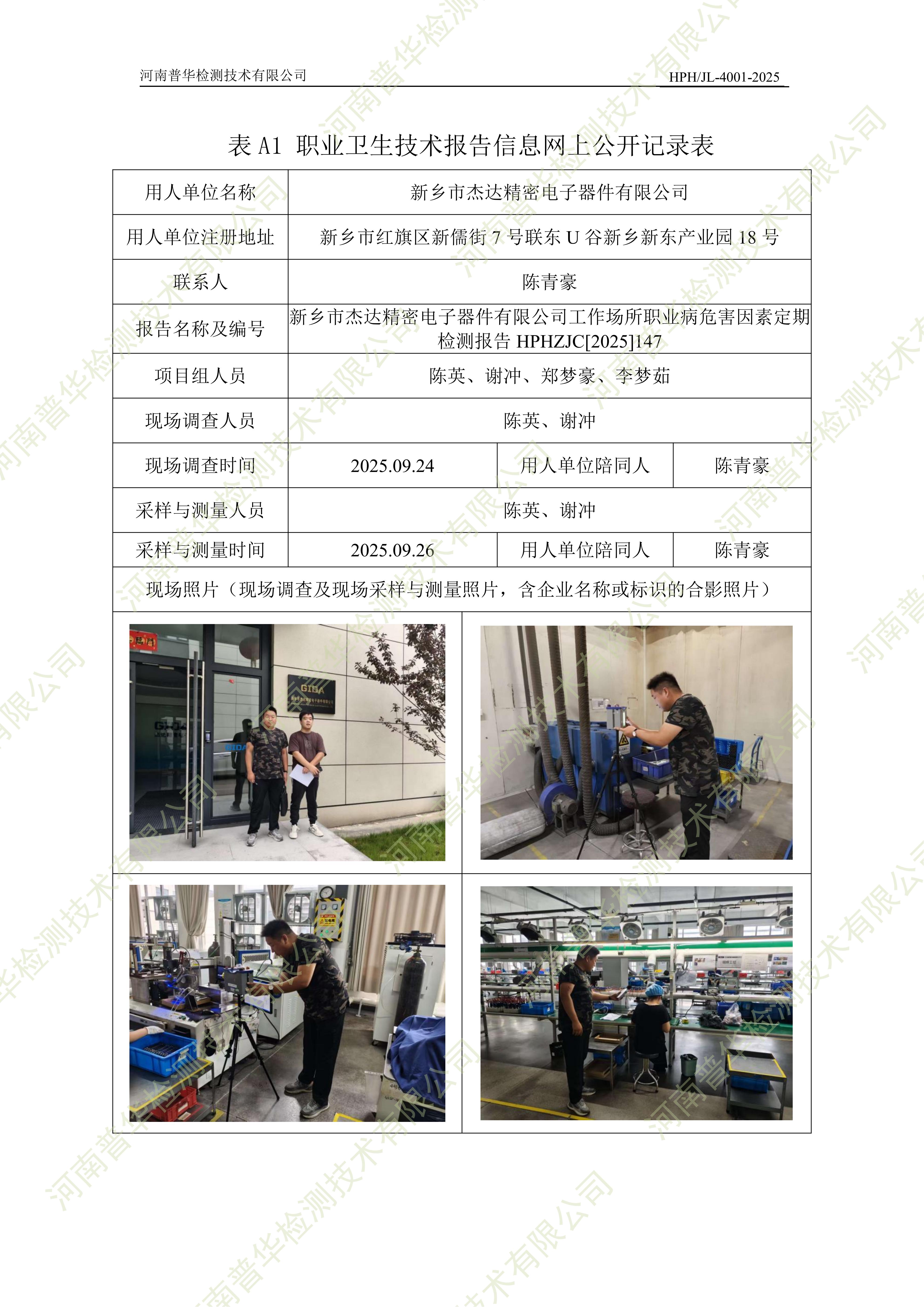 新乡市杰达精密电子器件有限公司工作场所职业病危害因素定期检测 点击次数:38 次