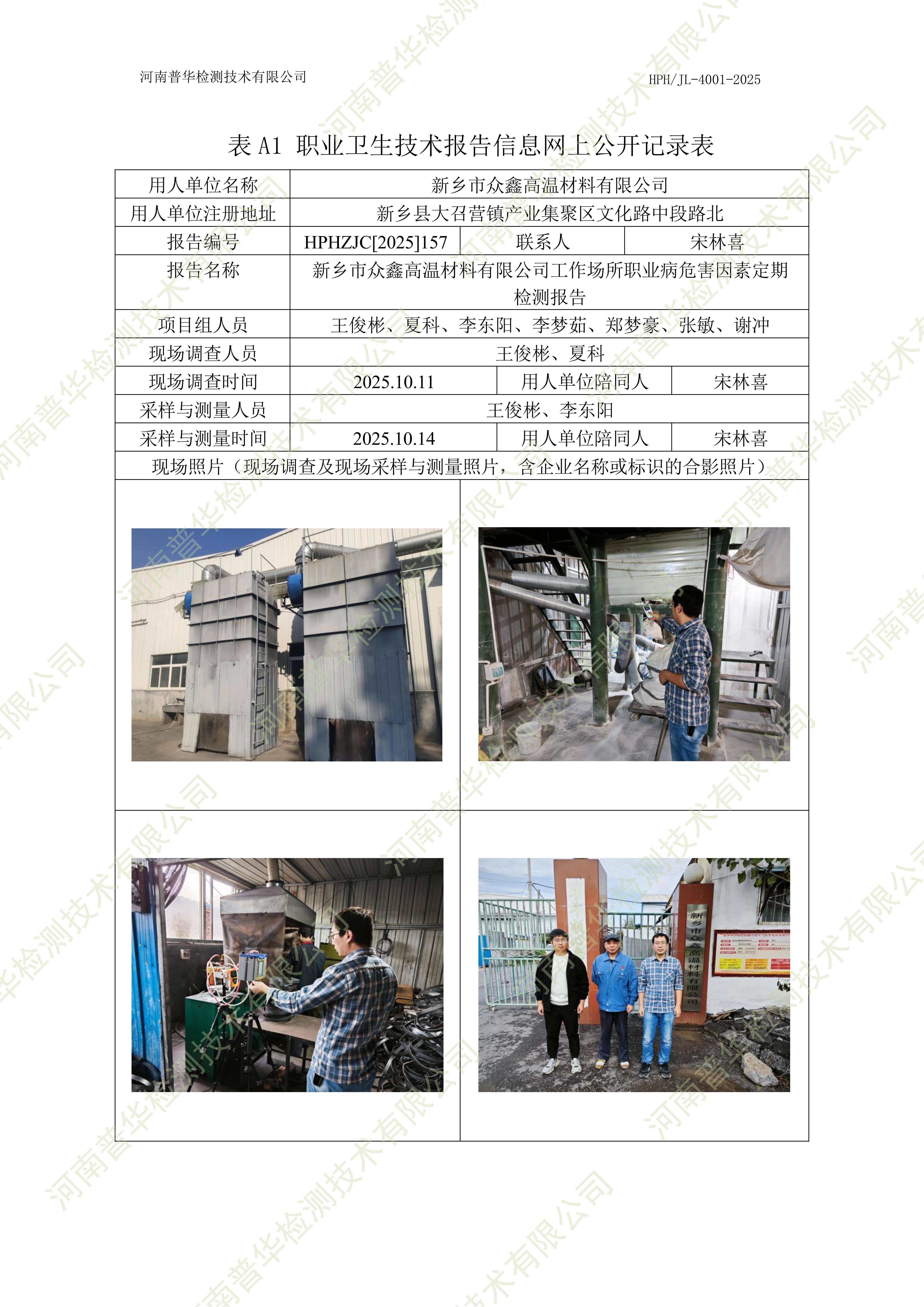 新乡市众鑫高温材料有限公司工作场所职业病危害因素定期 检测 点击次数:35 次