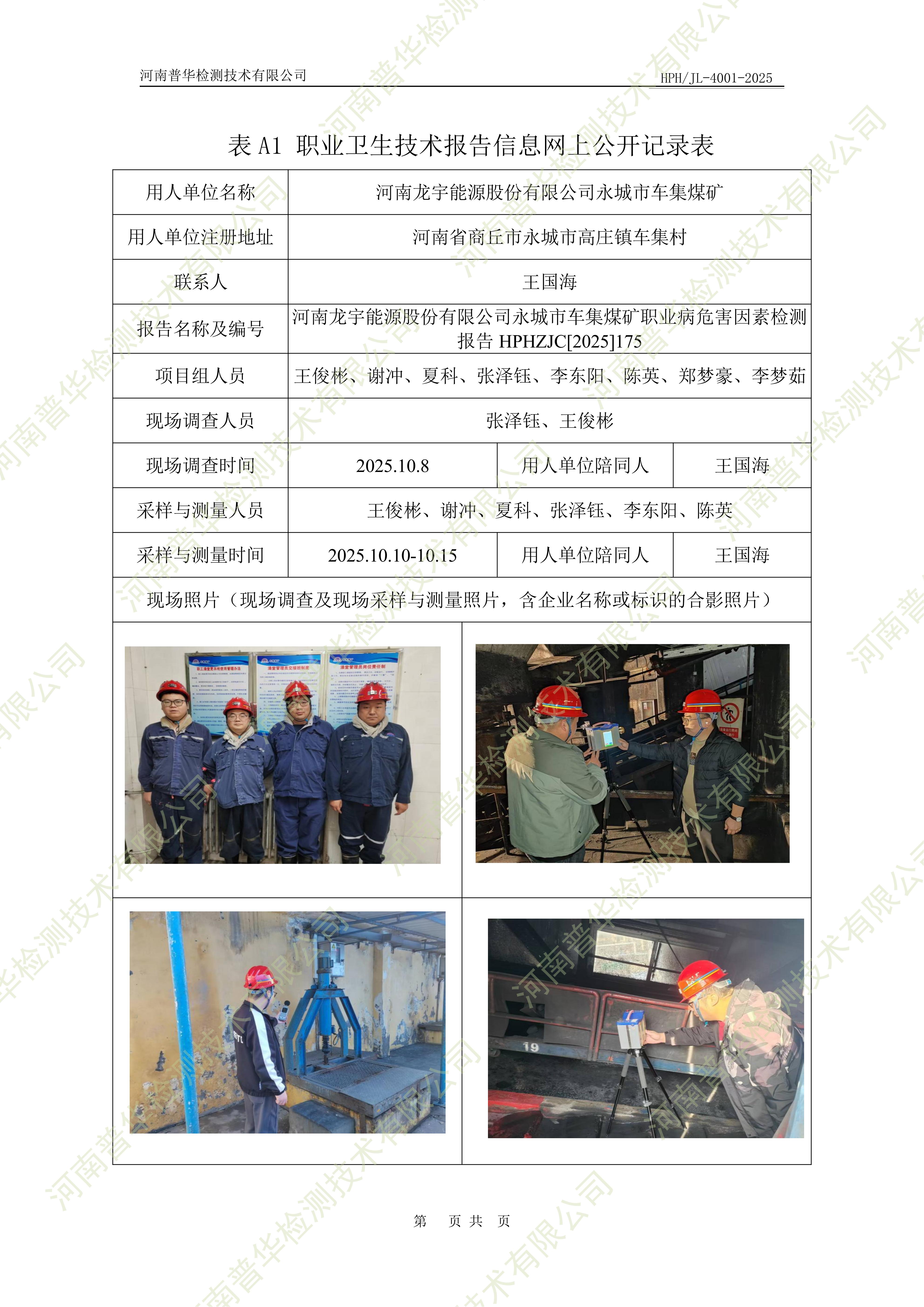 河南龙宇能源股份有限公司永城市车集煤矿职业病危害因素检测 点击次数:25 次