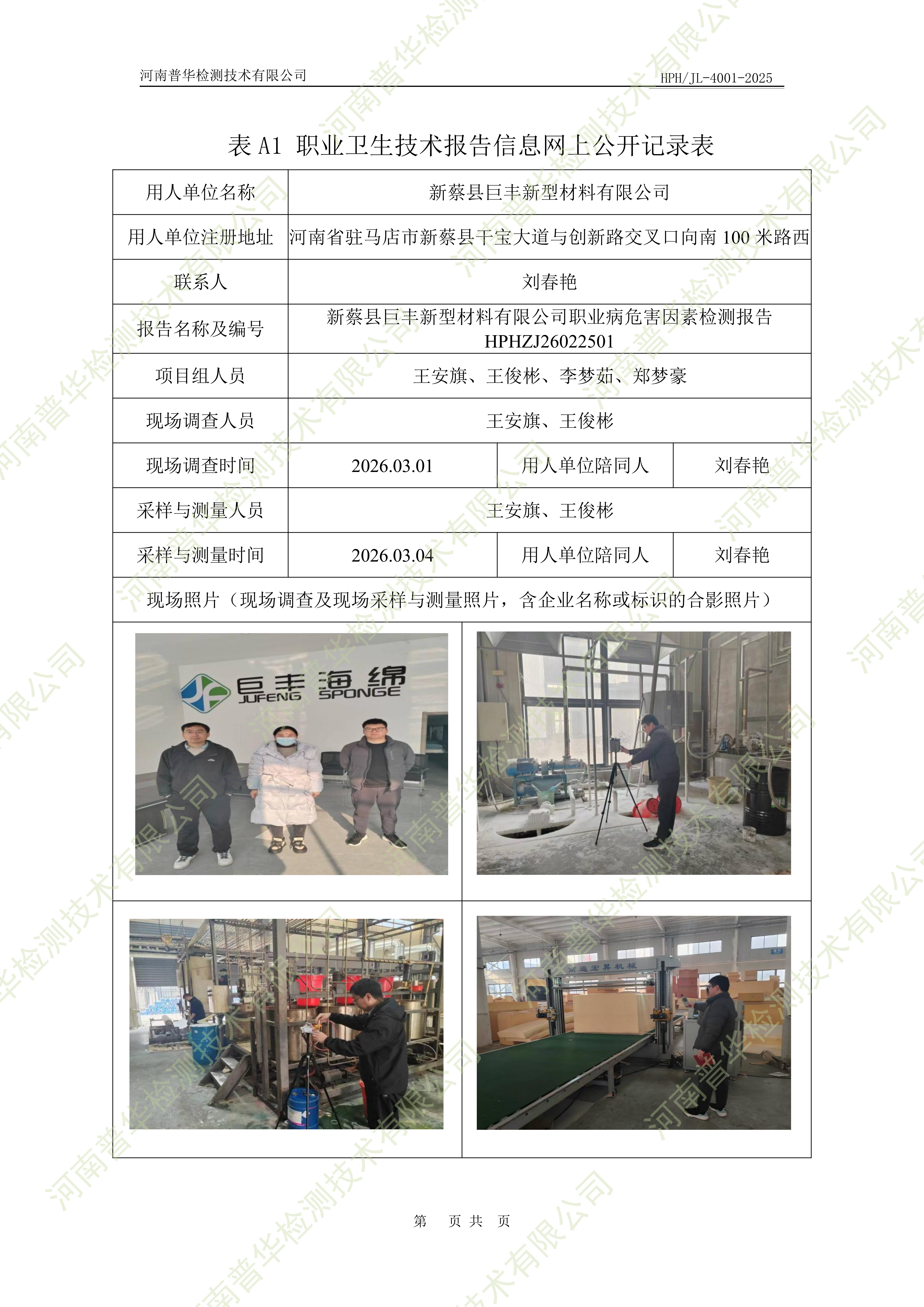 新蔡县巨丰新型材料有限公司职业病危害因素检测 点击次数:24 次