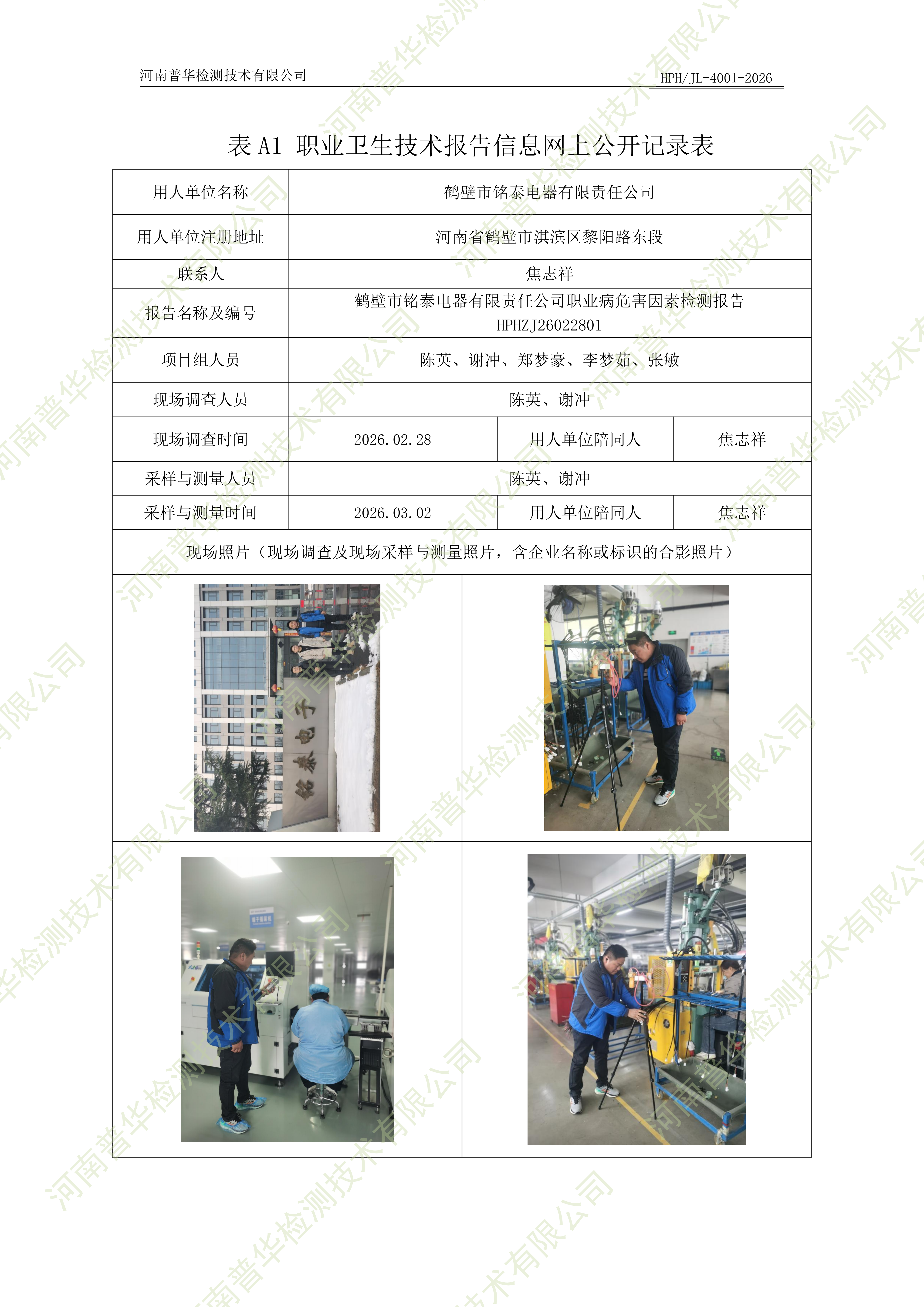 鹤壁市铭泰电器有限责任公司职业病危害因素检测 点击次数:25 次