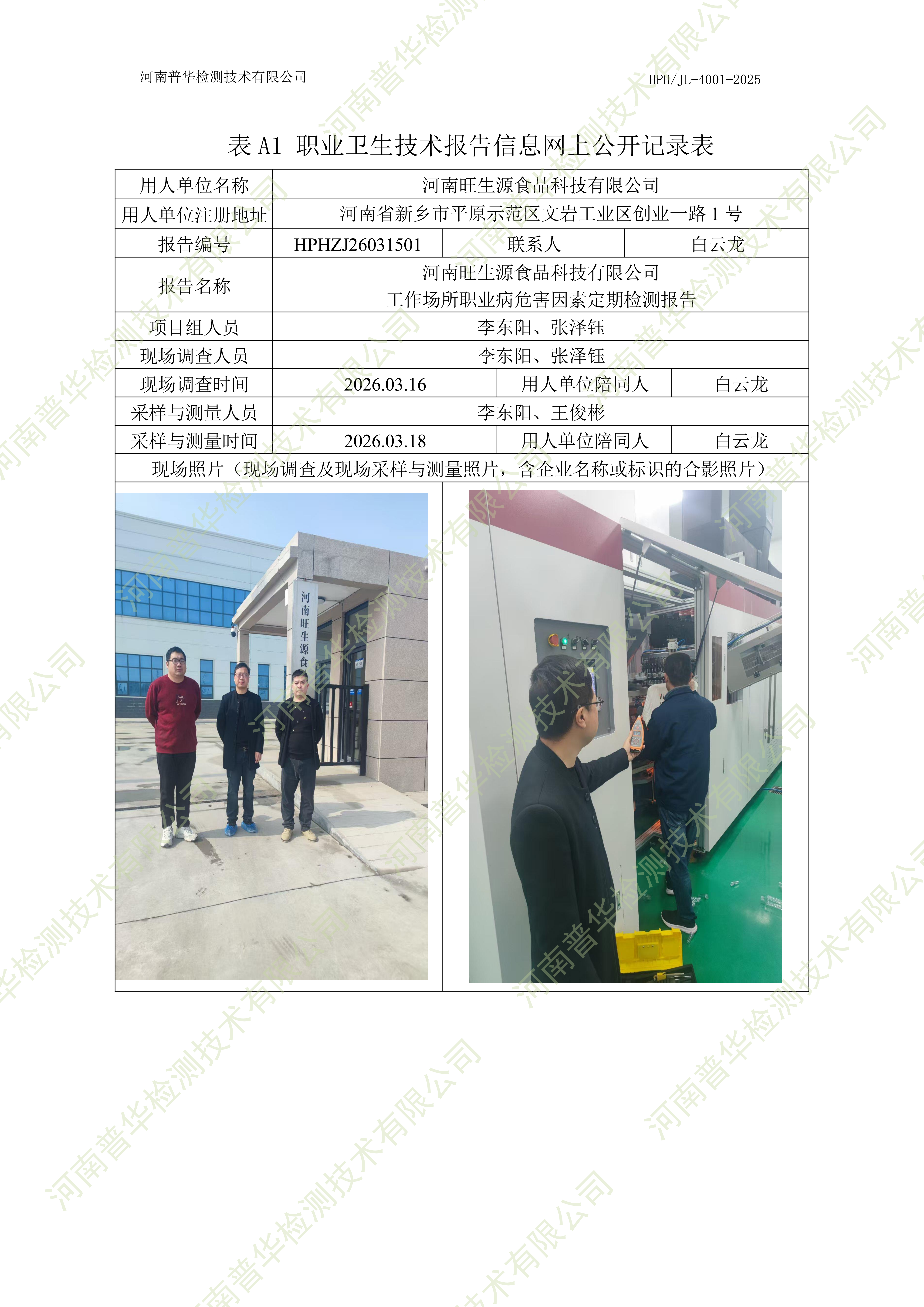 河南旺生源食品科技有限公司工作场所职业病危害因素定期检测 点击次数:6 次